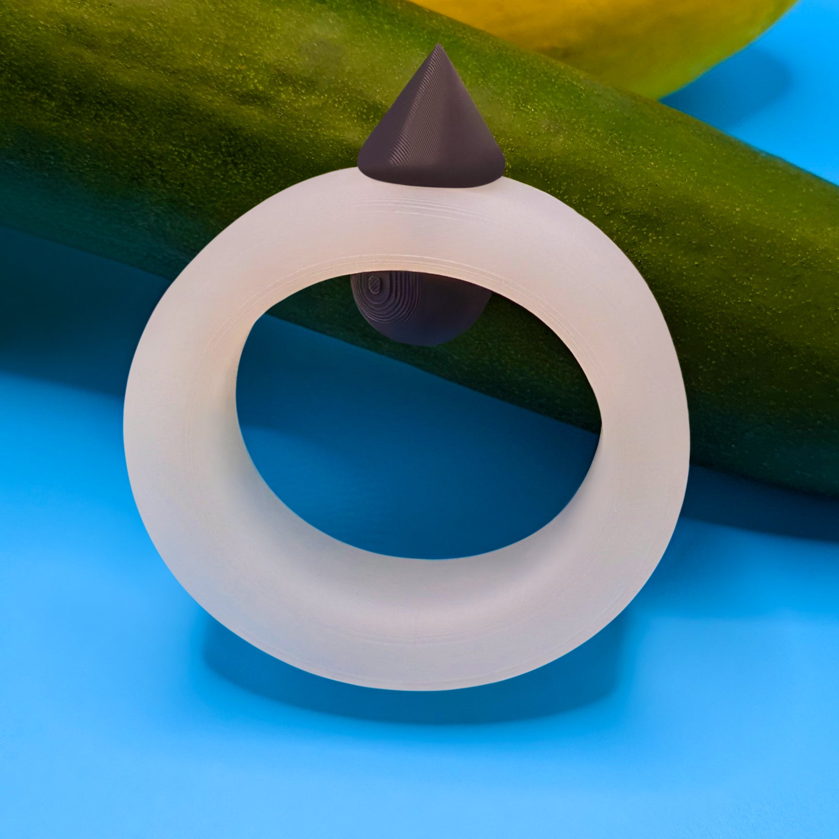 Translucent white ring with three plug holes and one black stimulator. Double ended stimulator has both a round or a spiked end. You choose!